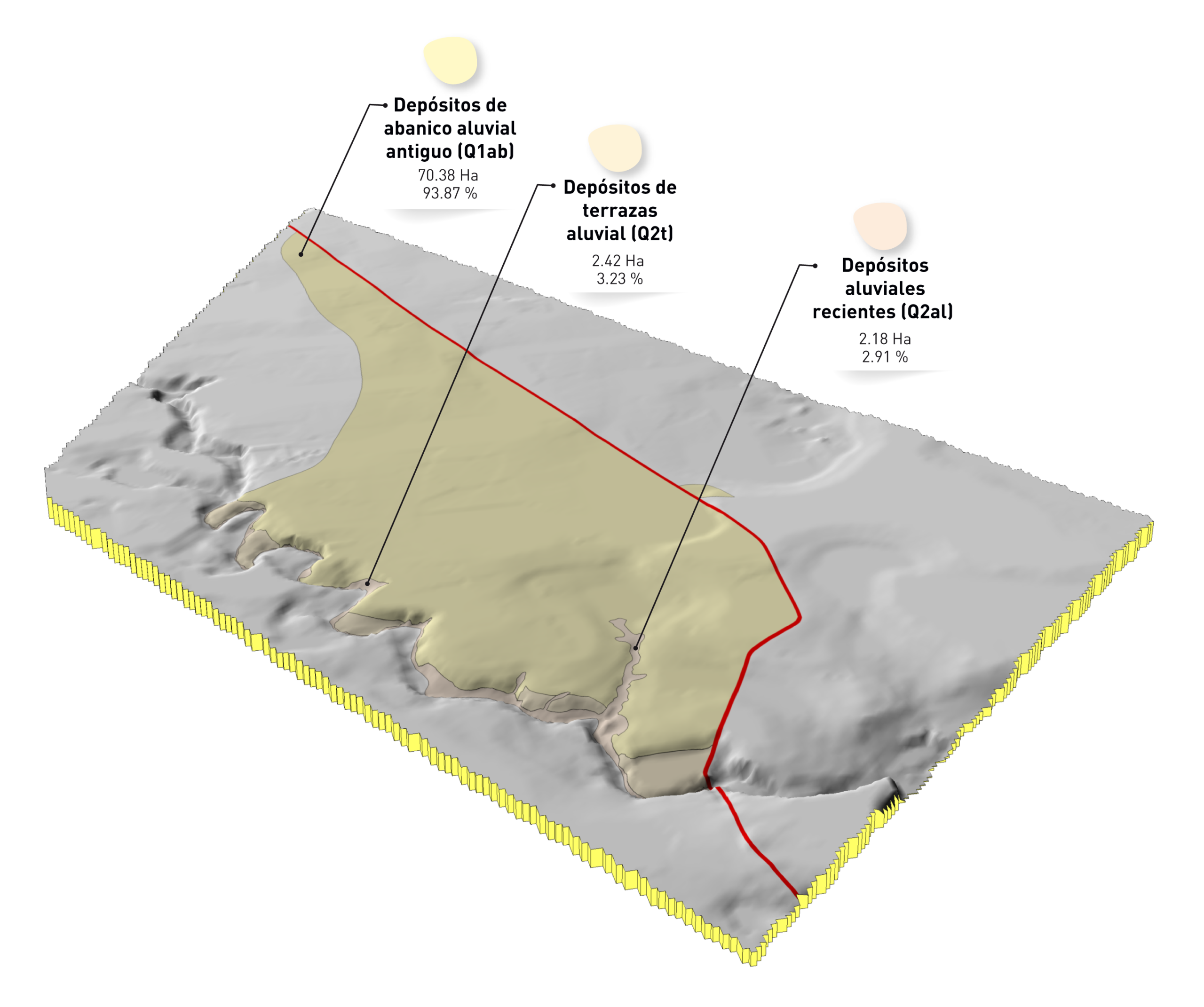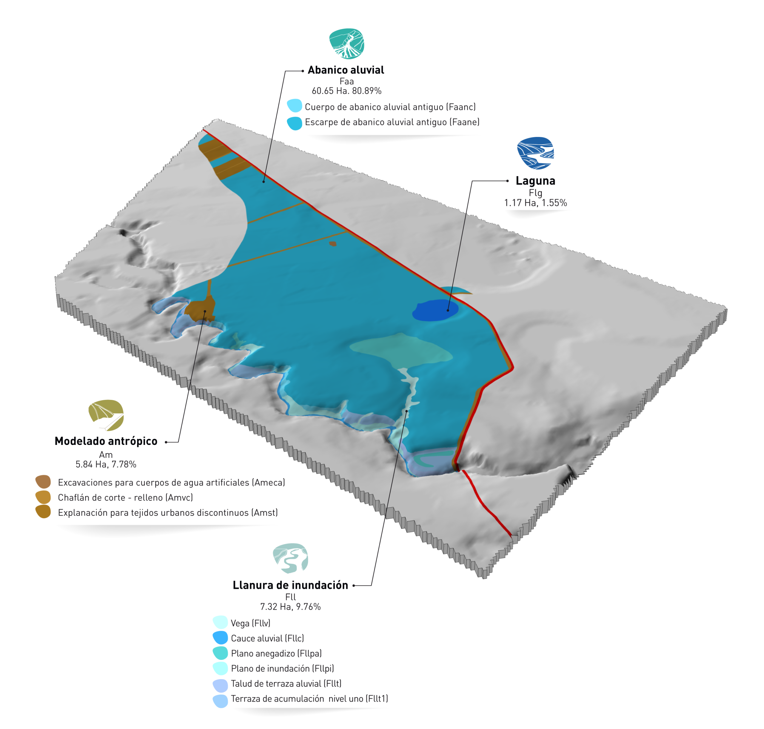 Las 4 unidades geomorfológicas tienen una alta representatividad, donde se diferencian las zonas plano onduladas asociadas a los abanicos, la disposición del terreno en forma de conos o lóbulos para los lomeríos y, por último, las zonas bajas y planas asociadas a la acción de los caños y ríos.