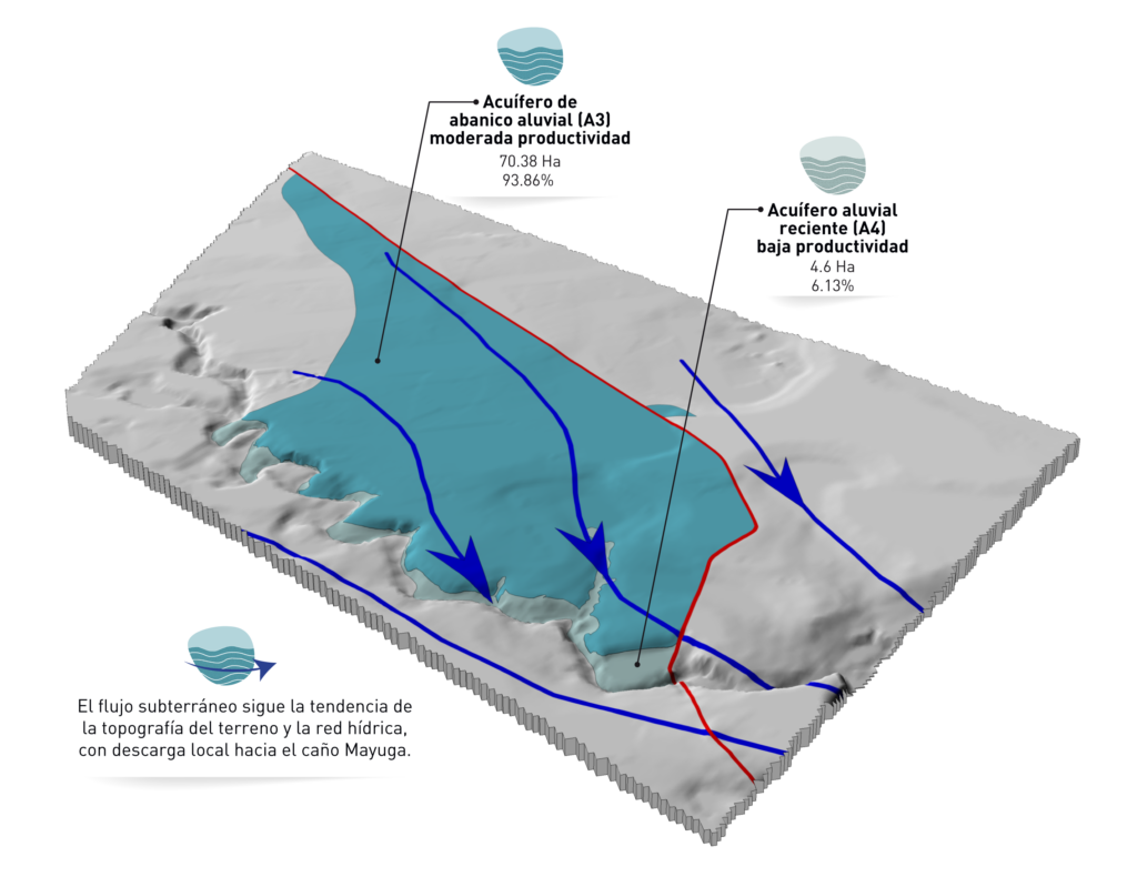 Sistema hidrogeológico desarrollado en formaciones geológicas porosas y permeables que permiten el ingreso, flujo y salida del agua subterránea, cuya recarga se da hacia las estribaciones del piedemonte y la descarga local hacia el caño Mayuga.