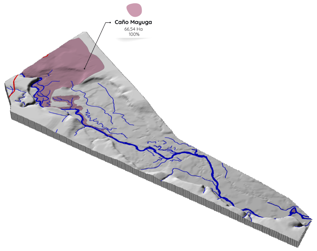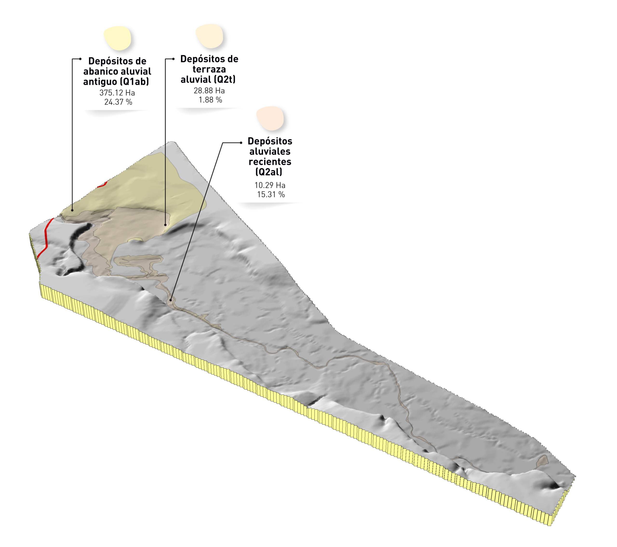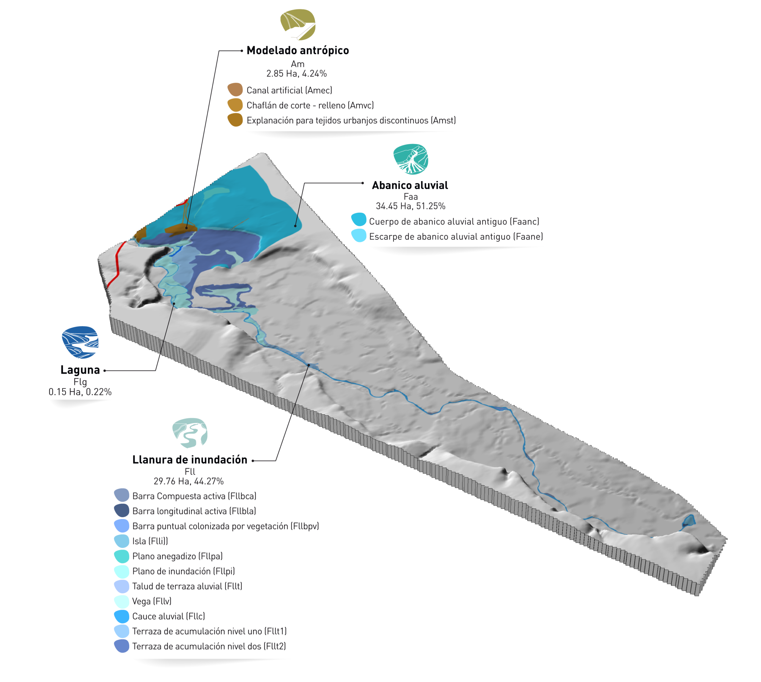 Las 4 unidades geomorfológicas tienen una alta representatividad, donde se diferencian las zonas plano onduladas asociadas a los abanicos, la disposición del terreno en forma de conos o lóbulos para los lomeríos y, por último, las zonas bajas y planas asociadas a la acción de los caños y ríos.