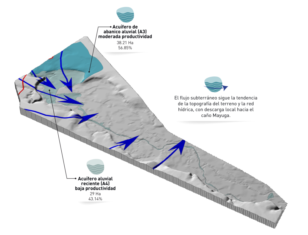Sistema hidrogeológico desarrollado en formaciones geológicas porosas y permeables que permiten el ingreso, flujo y salida del agua subterránea, cuya recarga se da hacia las estribaciones del piedemonte y la descarga local al caño Mayuga.